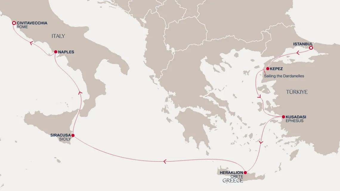 Маршрут круиза: Чивитавеккья / Рим - море - о. Миконос - Кушадасы / Эфес - Мармарис - море - Неаполь / Помпеи - Чивитавеккья / Рим