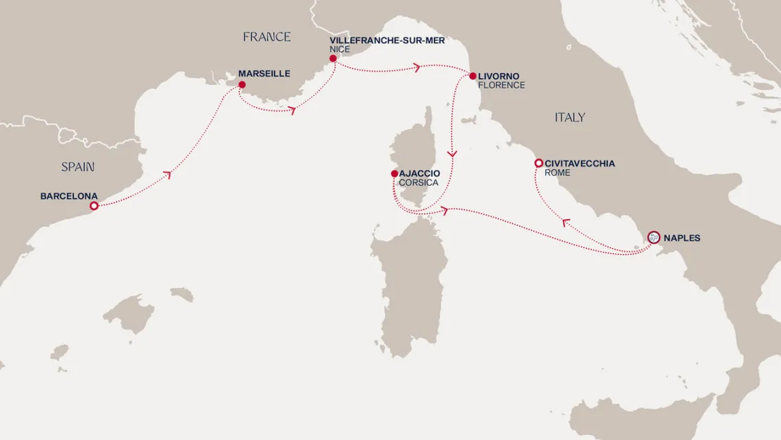 Маршрут круиза: Барселона - о. Майорка - Марсель - Ливорно / Флоренция, Пиза - Кальяри, о. Сардиния - Палермо, о. Сицилия - Валлетта - море - Барселона