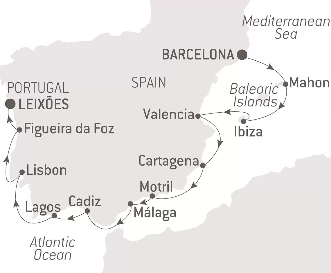 Маршрут круиза: Барселона - Аликанте - море - Лиссабон - Лиссабон - Касабланка - Касабланка - Танжер - Малага - Мотриль - море - Барселона - море - Кадиc / Севилья - море - Фуншал, о. Мадейра - море - море - море - море - море - море - Сент-Джонс, о.Антигуа - Роуд Бэй, о. Ангилья - Сан-Хуан - море - море - Майами