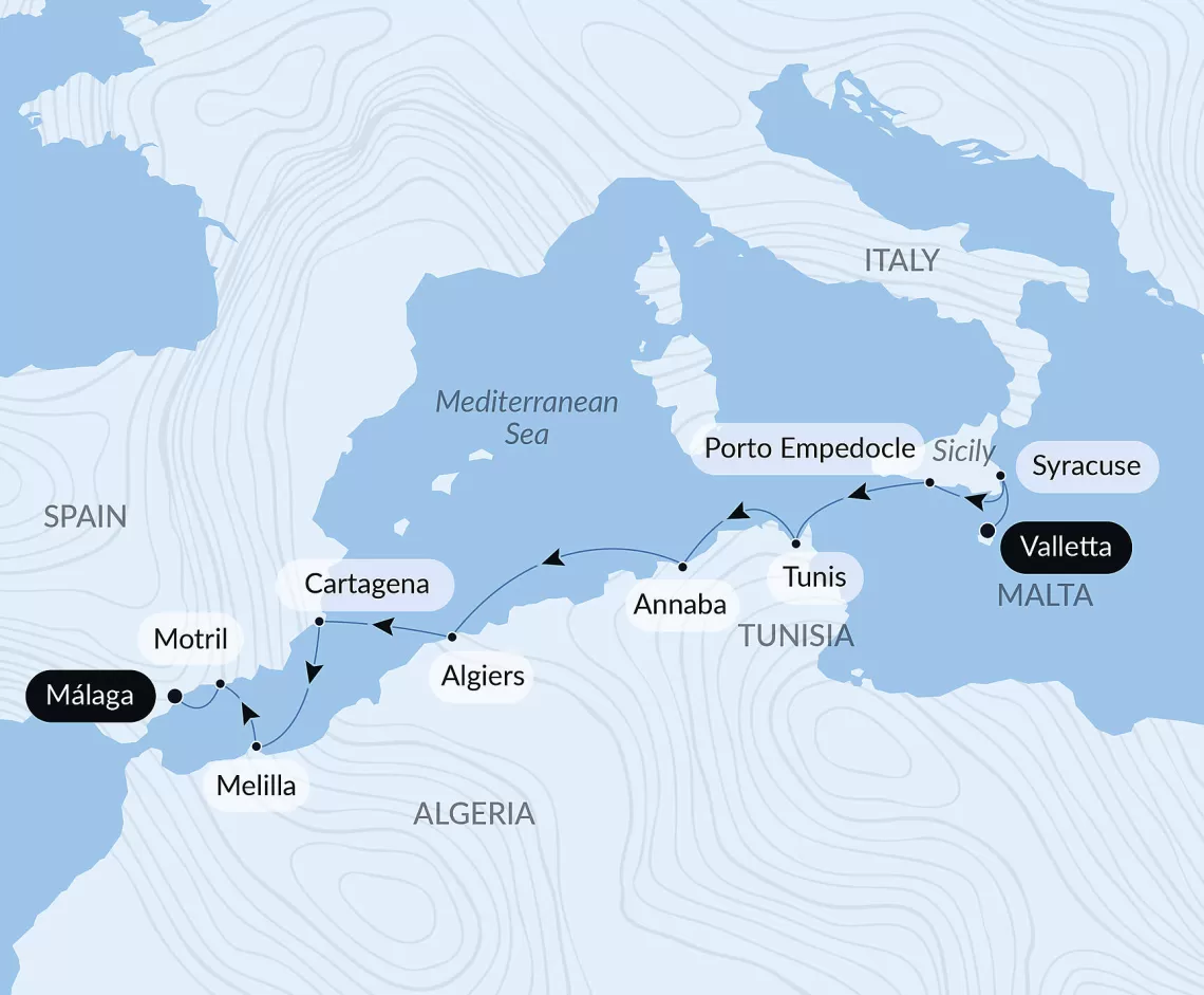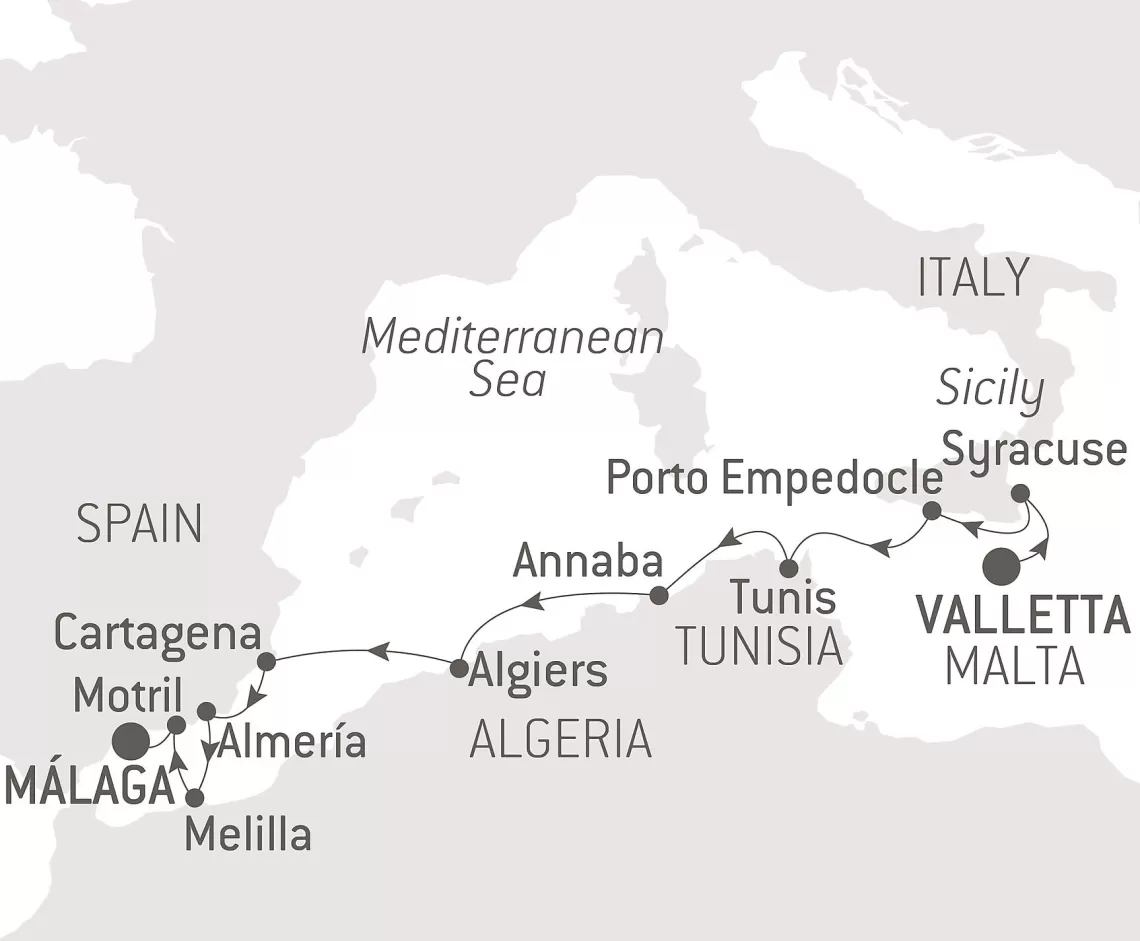 Маршрут круиза: Пирей / Афины - о. Милос - Ираклион, о.Крит - море - Джардини-Наксос, о. Сицилия - Валлетта - Ла-Гулетт - море - о. Ибица - Барселона - море - Кадиc / Севилья - Танжер - Мотриль - Картахена - море - Сен-Тропе - Монте-Карло - Ливорно / Флоренция, Пиза - Чивитавеккья / Рим