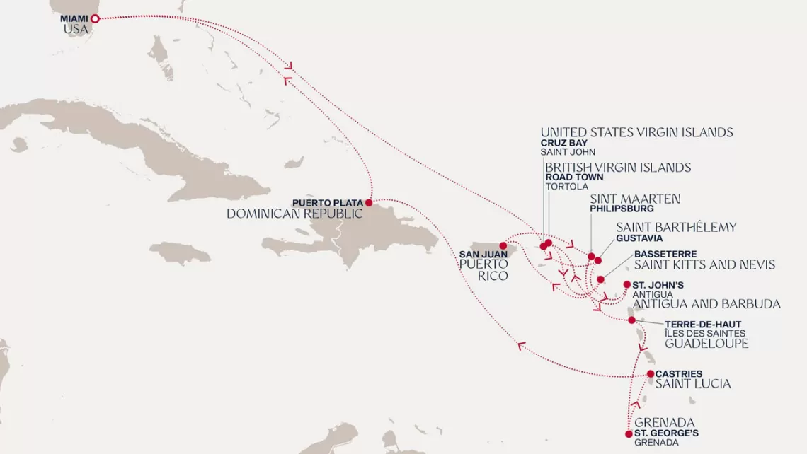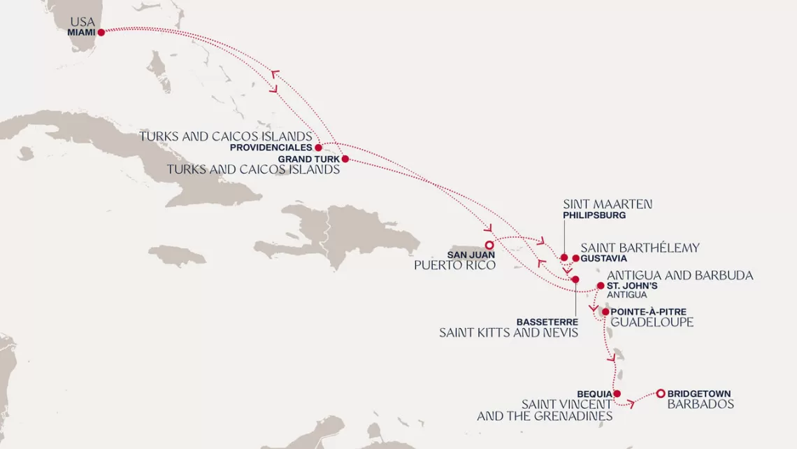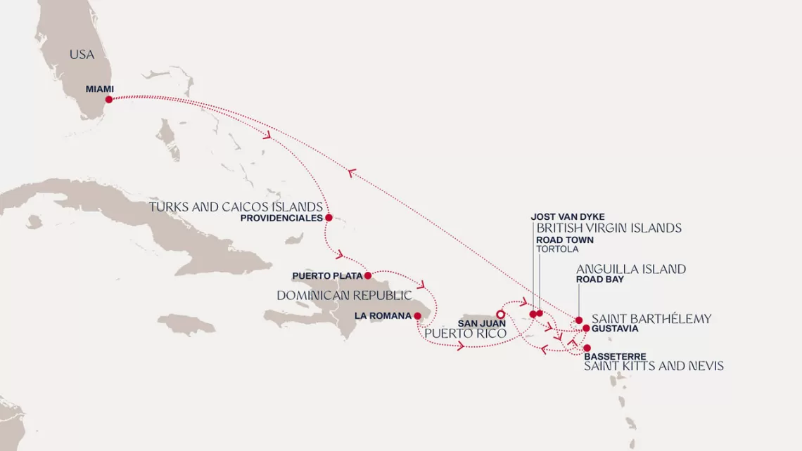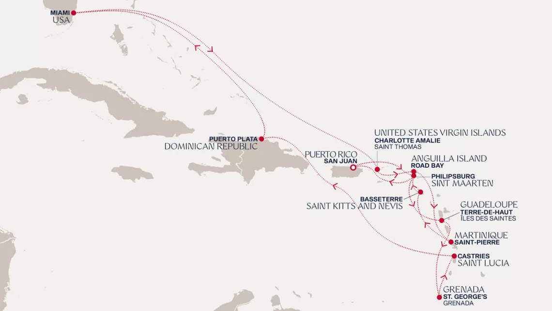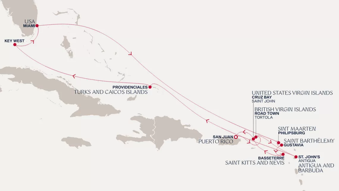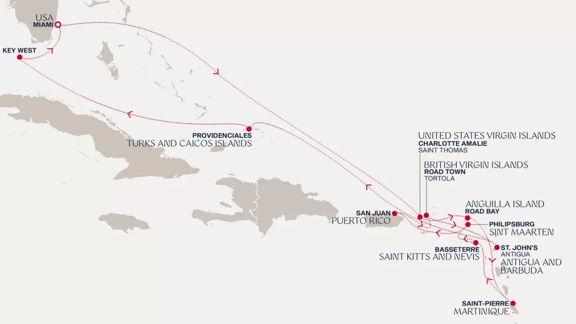 Маршрут круиза: Бриджтаун, о. Барбадос - Фор-де-Франс, о. Мартиника - Бастер, о. Сент-Китс - Сан-Хуан - Род-Таун, о. Тортола - Сент-Джонс, о.Антигуа - Густавия, о. Сен-Бартельми - Роуд Бэй, о. Ангилья - море - море - Майами - море - море - Ла-Романа - Сан-Хуан - Бастер, о. Сент-Китс - Ле Труа-Иле, о. Мартиника - о. Бекия - Кингстаун, о. Сент-Винсент - Бриджтаун, о. Барбадос