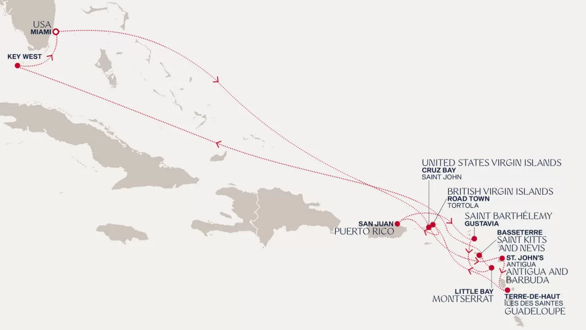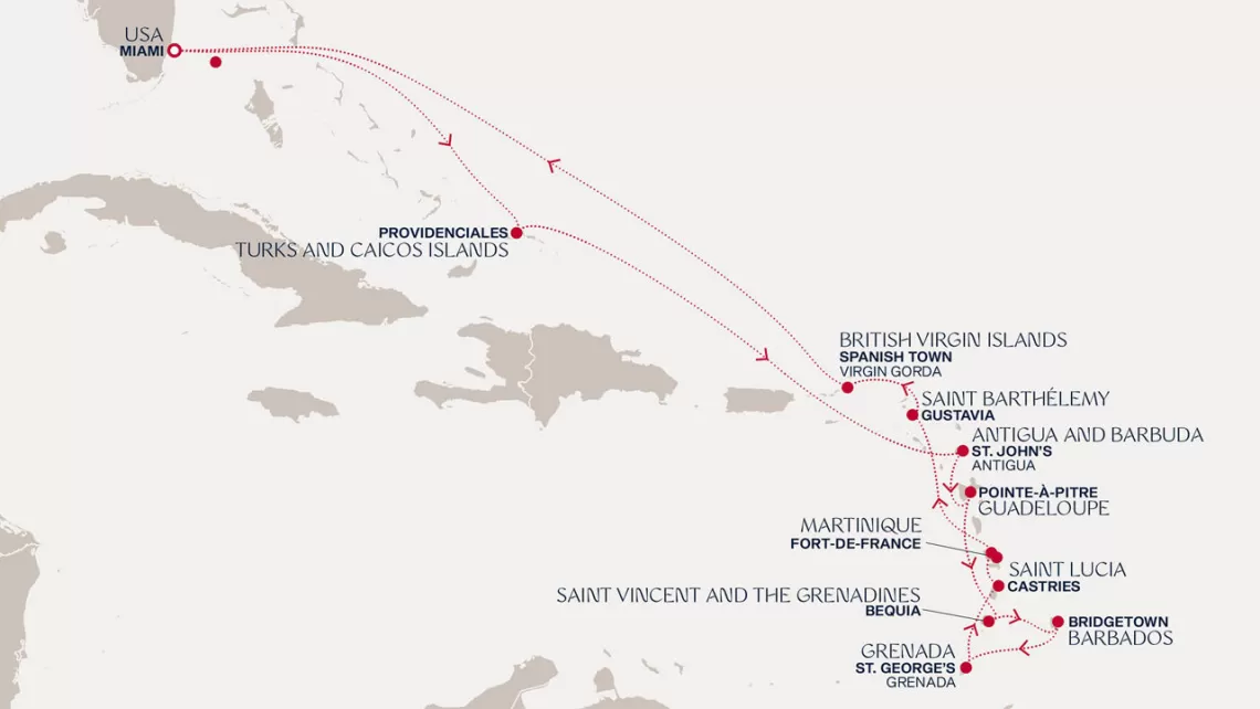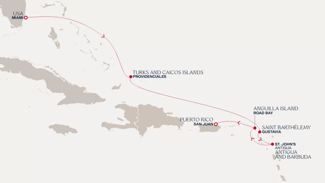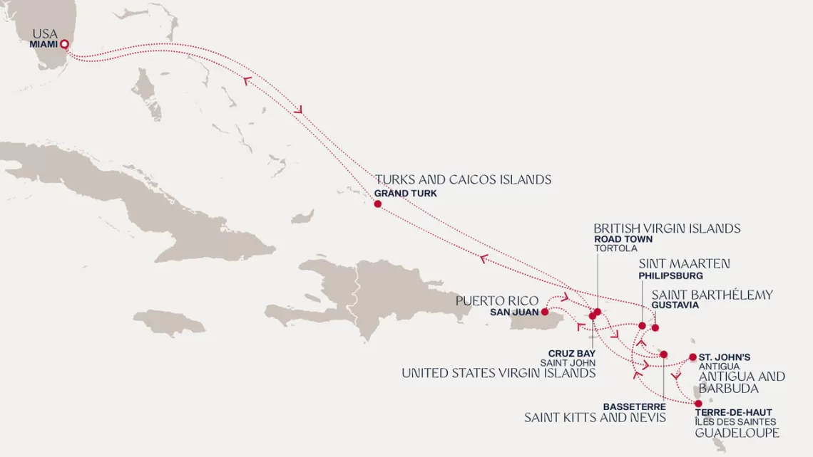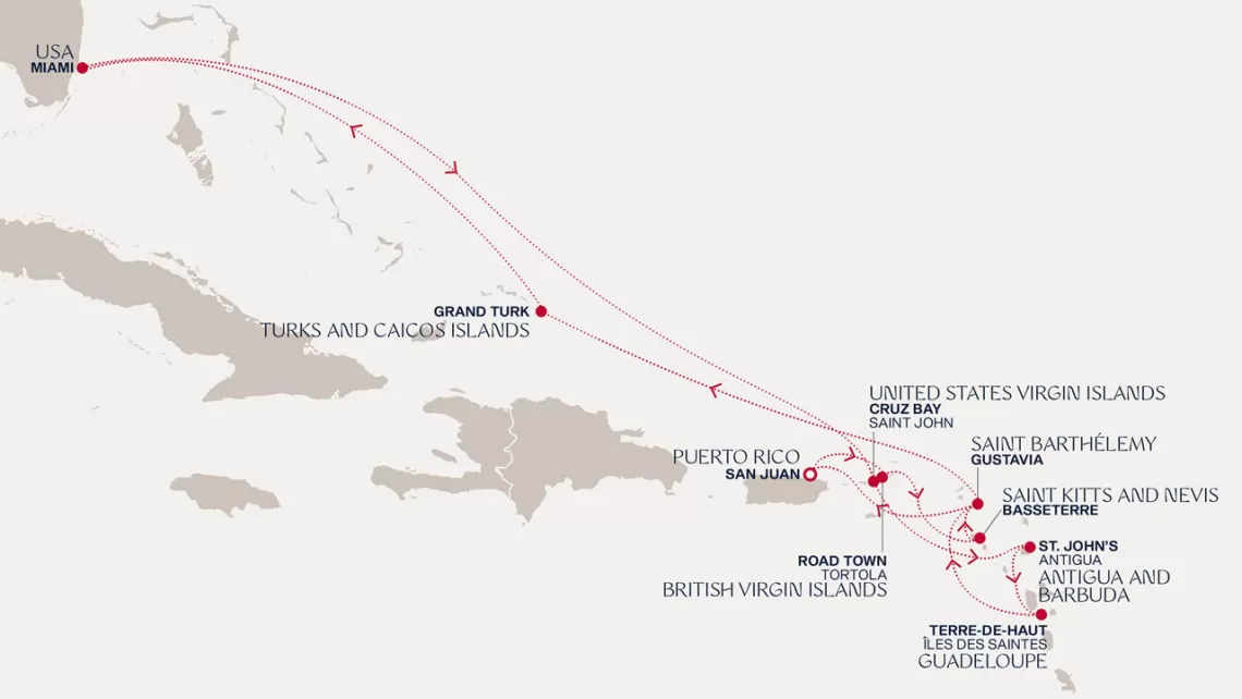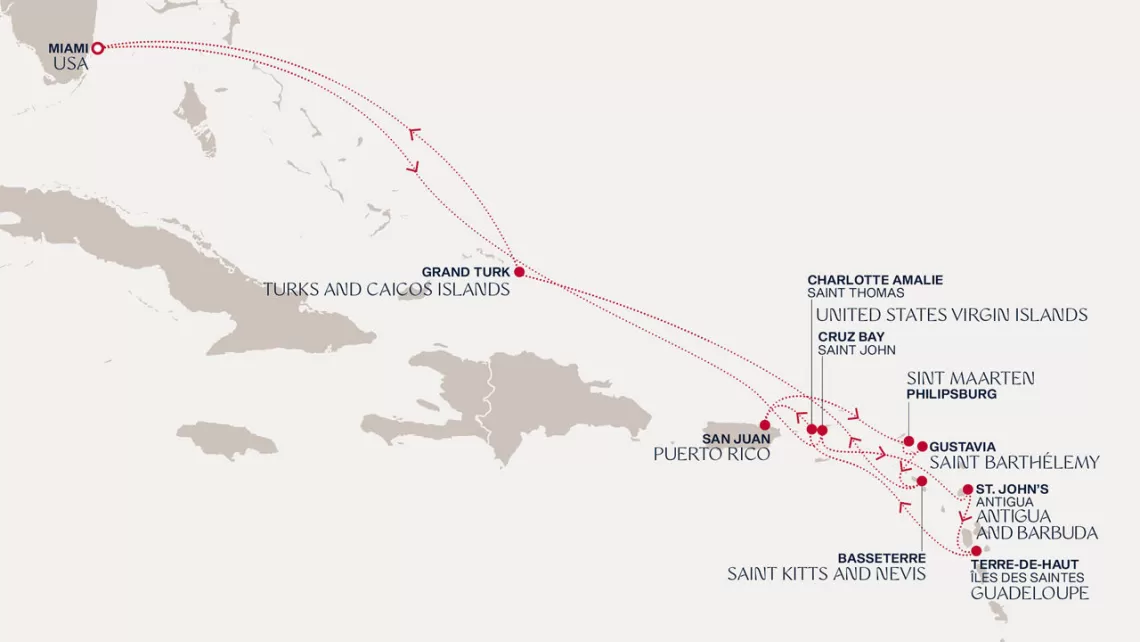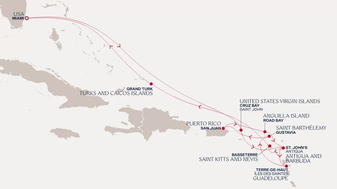 Маршрут круиза: Бриджтаун, о. Барбадос - Фор-де-Франс, о. Мартиника - Бастер, о. Сент-Китс - Сан-Хуан - Род-Таун, о. Тортола - Сент-Джонс, о.Антигуа - Густавия, о. Сен-Бартельми - Роуд Бэй, о. Ангилья - море - море - Майами - море - море - Ла-Романа - Сан-Хуан - Бастер, о. Сент-Китс - Ле Труа-Иле, о. Мартиника - о. Бекия - Кингстаун, о. Сент-Винсент - Бриджтаун, о. Барбадос