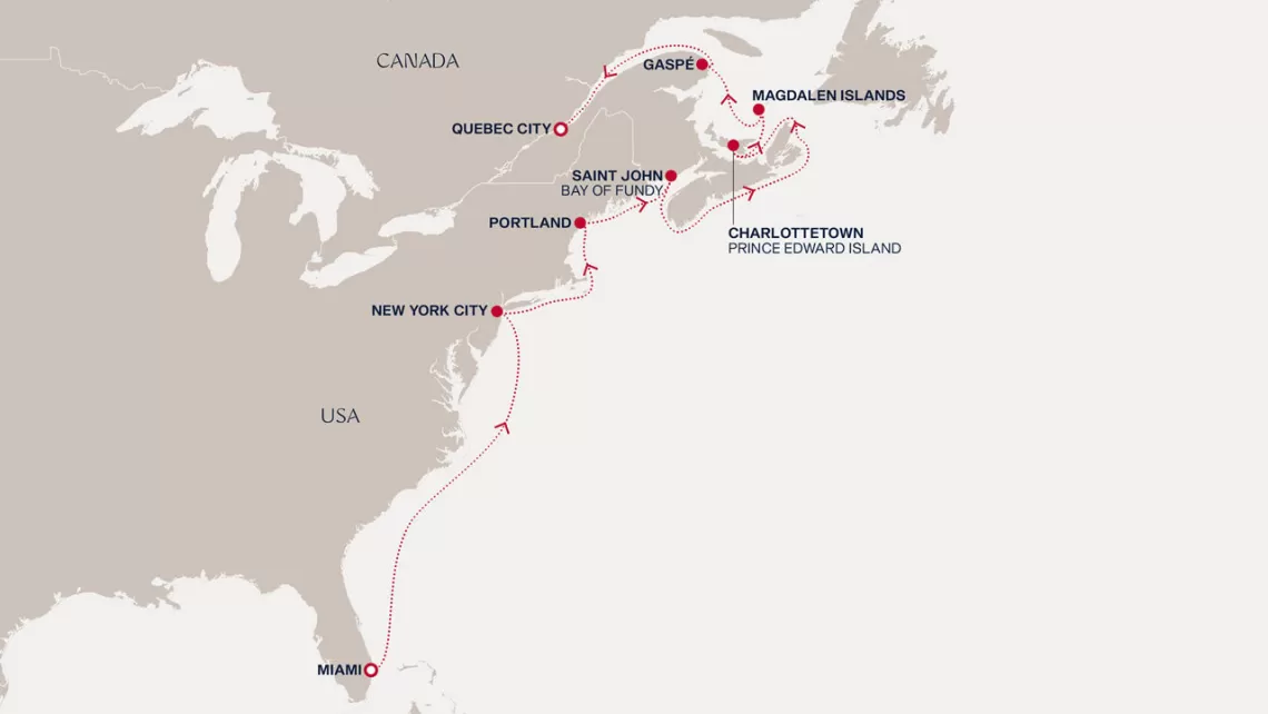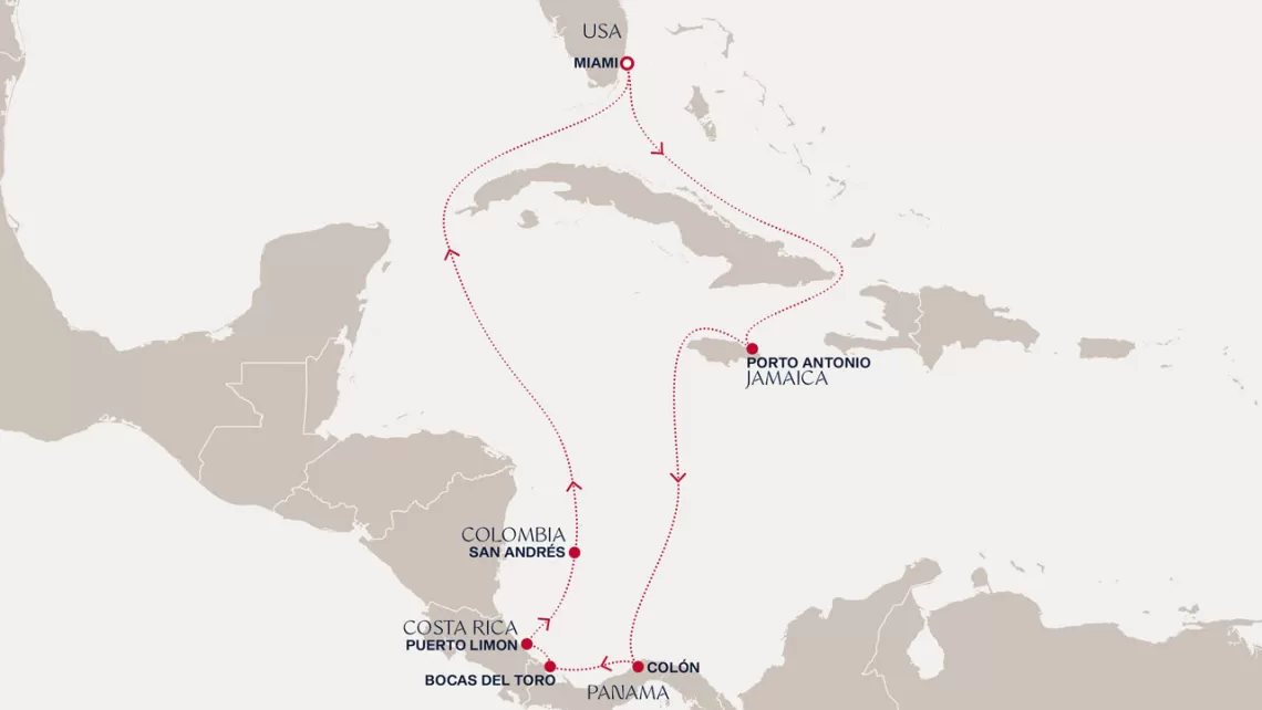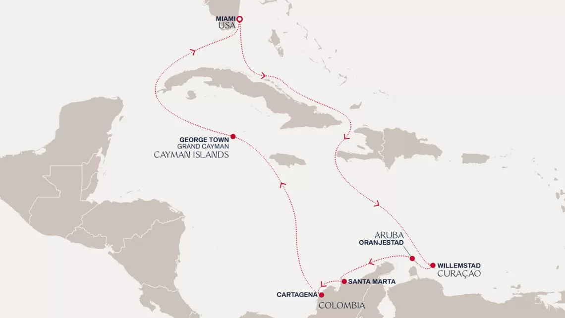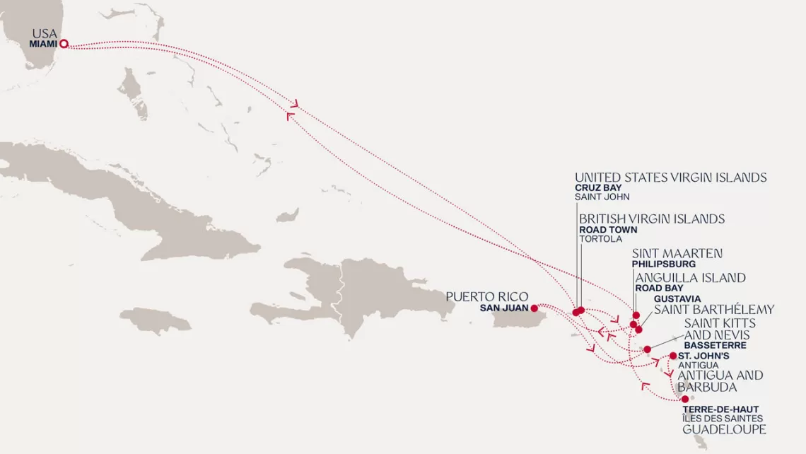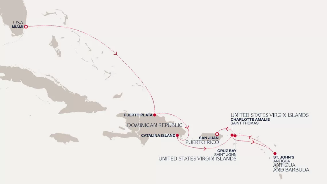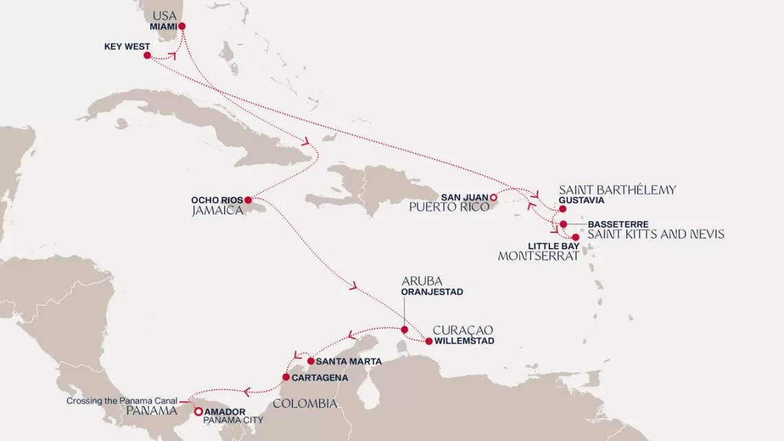 Маршрут круиза: Бриджтаун, о. Барбадос - Фор-де-Франс, о. Мартиника - Бастер, о. Сент-Китс - Сан-Хуан - Род-Таун, о. Тортола - Сент-Джонс, о.Антигуа - Густавия, о. Сен-Бартельми - Роуд Бэй, о. Ангилья - море - море - Майами - море - море - Ла-Романа - Сан-Хуан - Бастер, о. Сент-Китс - Ле Труа-Иле, о. Мартиника - о. Бекия - Кингстаун, о. Сент-Винсент - Бриджтаун, о. Барбадос