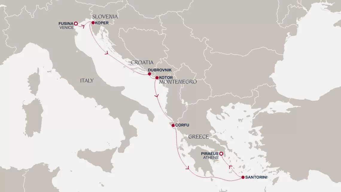 Маршрут круиза: Барселона - Марсель - Аяччо, о. Корсика - Ливорно / Флоренция, Пиза - Чивитавеккья / Рим - море - Валенсия - Пальма-де-Майорка - Барселона - море - Неаполь / Помпеи - море - Валлетта - Сиракузы, о. Сицилия - море - о. Корфу - Котор - Бриндизи - Сплит - Венеция
