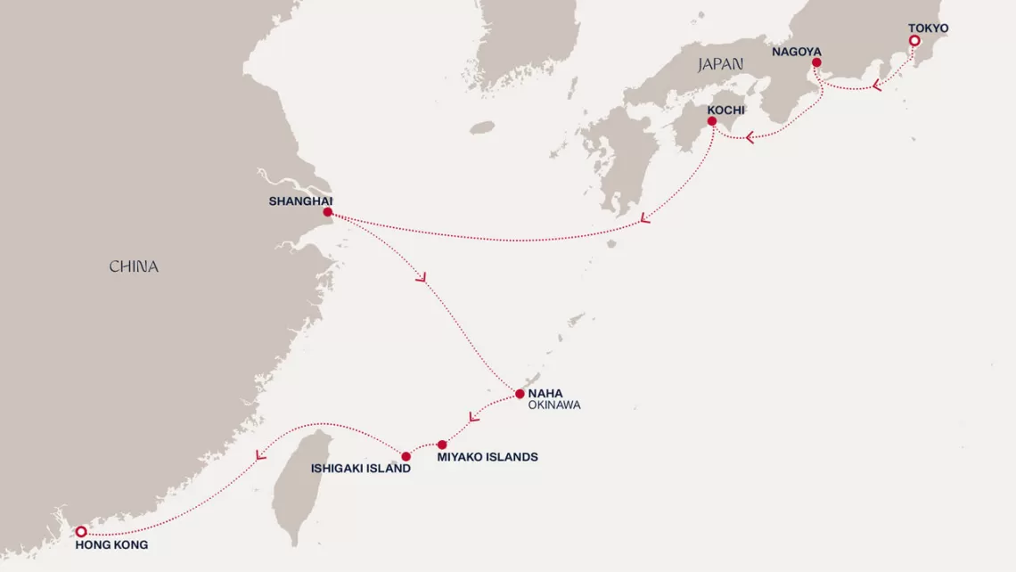 Маршрут круиза: Токио - Нагоя - Коти - море - Шанхай - море - Наха - Миякодзима - Исигаки, о-ва Сакисима - море - Гонконг - Гонконг