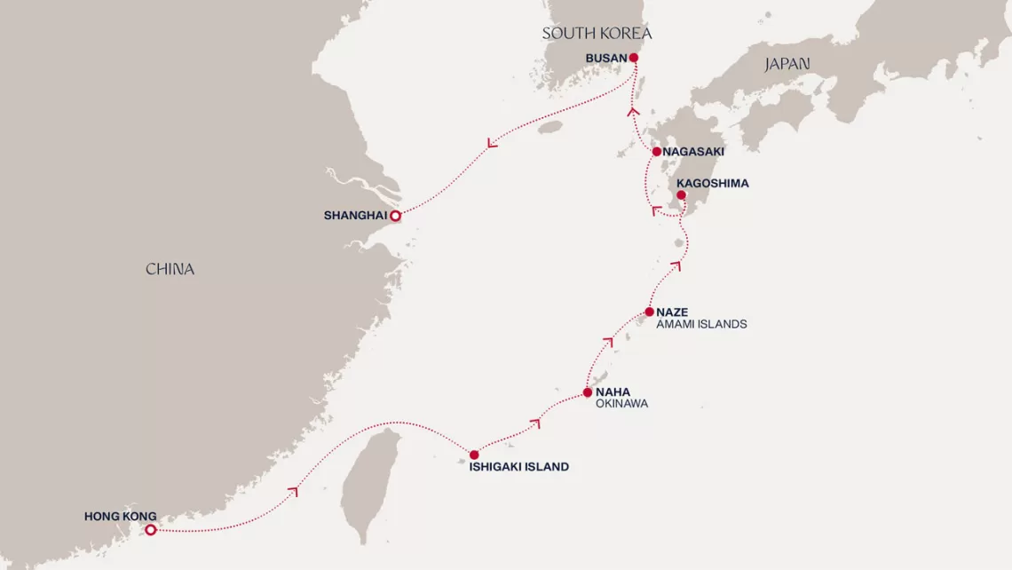 Маршрут круиза: Гонконг - море - Исигаки, о-ва Сакисима - Наха - Эр - Кагосима - Нагасаки - Пусан - море - Шанхай