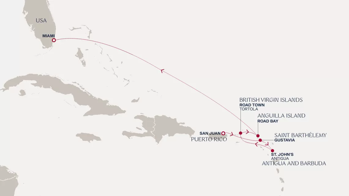 Маршрут круиза: Майами - море - море - о. Сент-Джон - Сент-Джонс, о.Антигуа - о. Тер-де-О, Гваделупа - Филипсбург, о. Синт-Мартен - Сан-Хуан - Бастер, о. Сент-Китс - Род-Таун, о. Тортола - Густавия, о. Сен-Бартельми - Густавия, о. Сен-Бартельми - Роуд Бэй, о. Ангилья - море - море - Майами