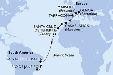 Маршрут круиза: Генуя / Милан - Чивитавеккья / Рим - Аяччо, о. Корсика - Марсель - Барселона - море - море - море - Лас-Пальмас, о. Гран-Канария - море - море - море - море - море - море - Филипсбург, о. Синт-Мартен - Бастер, о. Сент-Китс - Розо, о. Доминика - Бриджтаун, о. Барбадос - Сент-Джорджес, о. Гренада - Кингстаун, о. Сент-Винсент - Фор-де-Франс, о. Мартиника