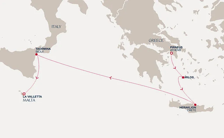 Маршрут круиза: Валлетта - Порт Эмпедокле, о. Сицилия - Трапани, о. Сицилия - Палермо, о. Сицилия - о. Липари - о. Стромболи - Реджо-ди-Калабрия - Сиракузы, о. Сицилия - Таормина, о. Сицилия - Валлетта