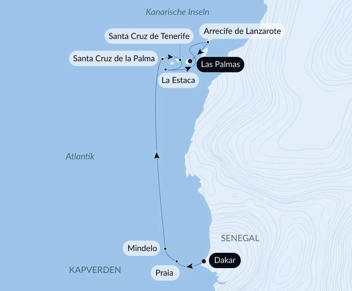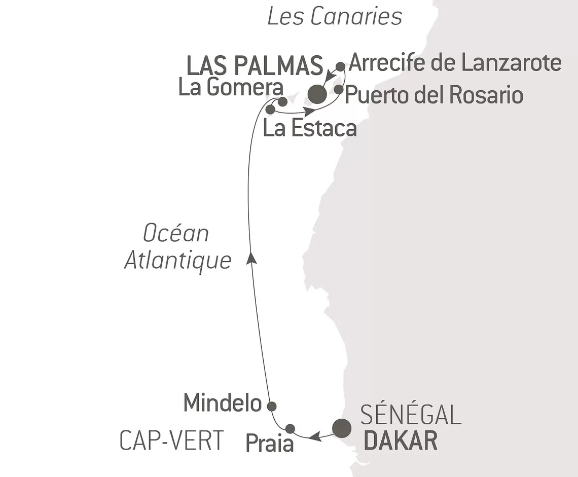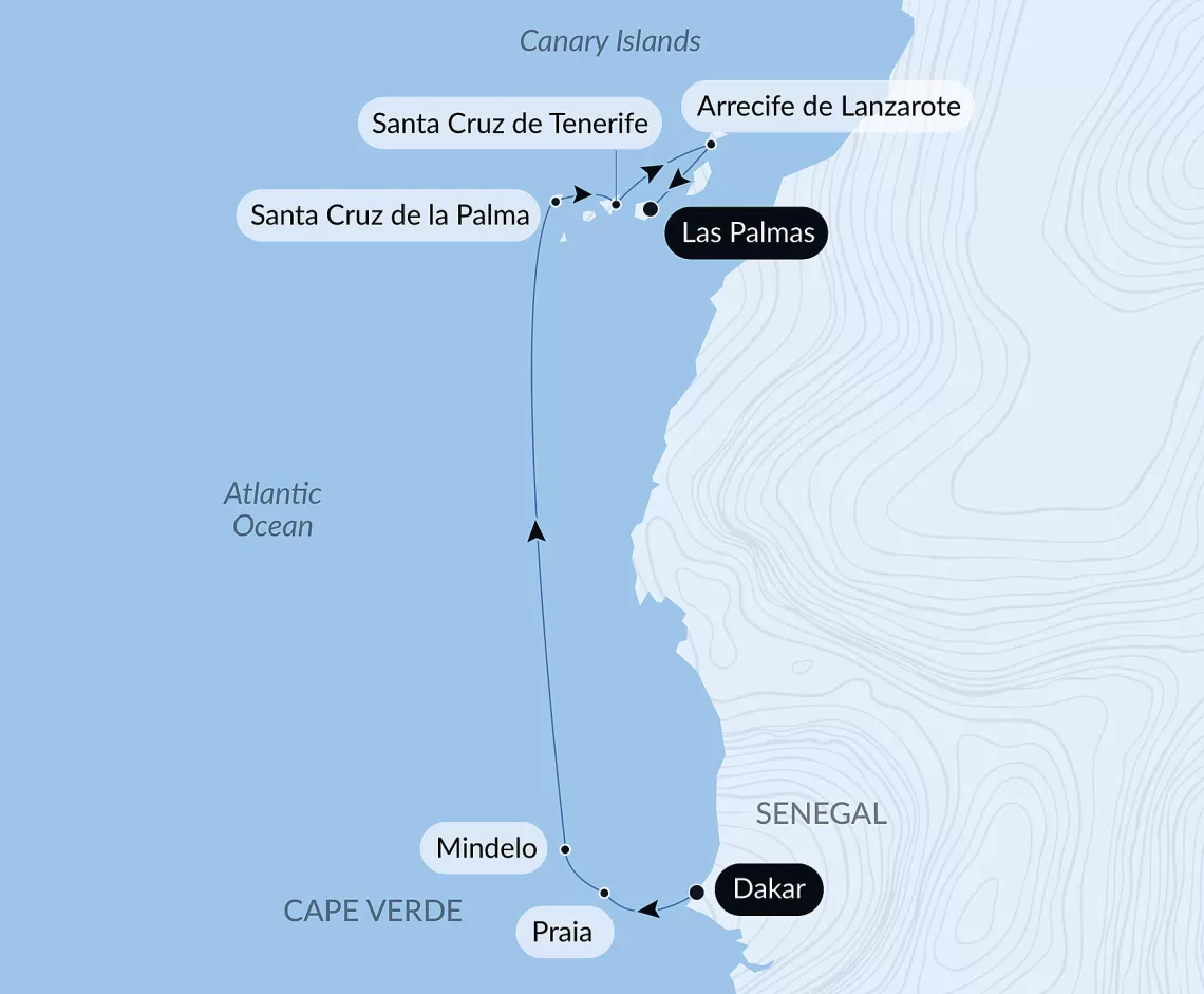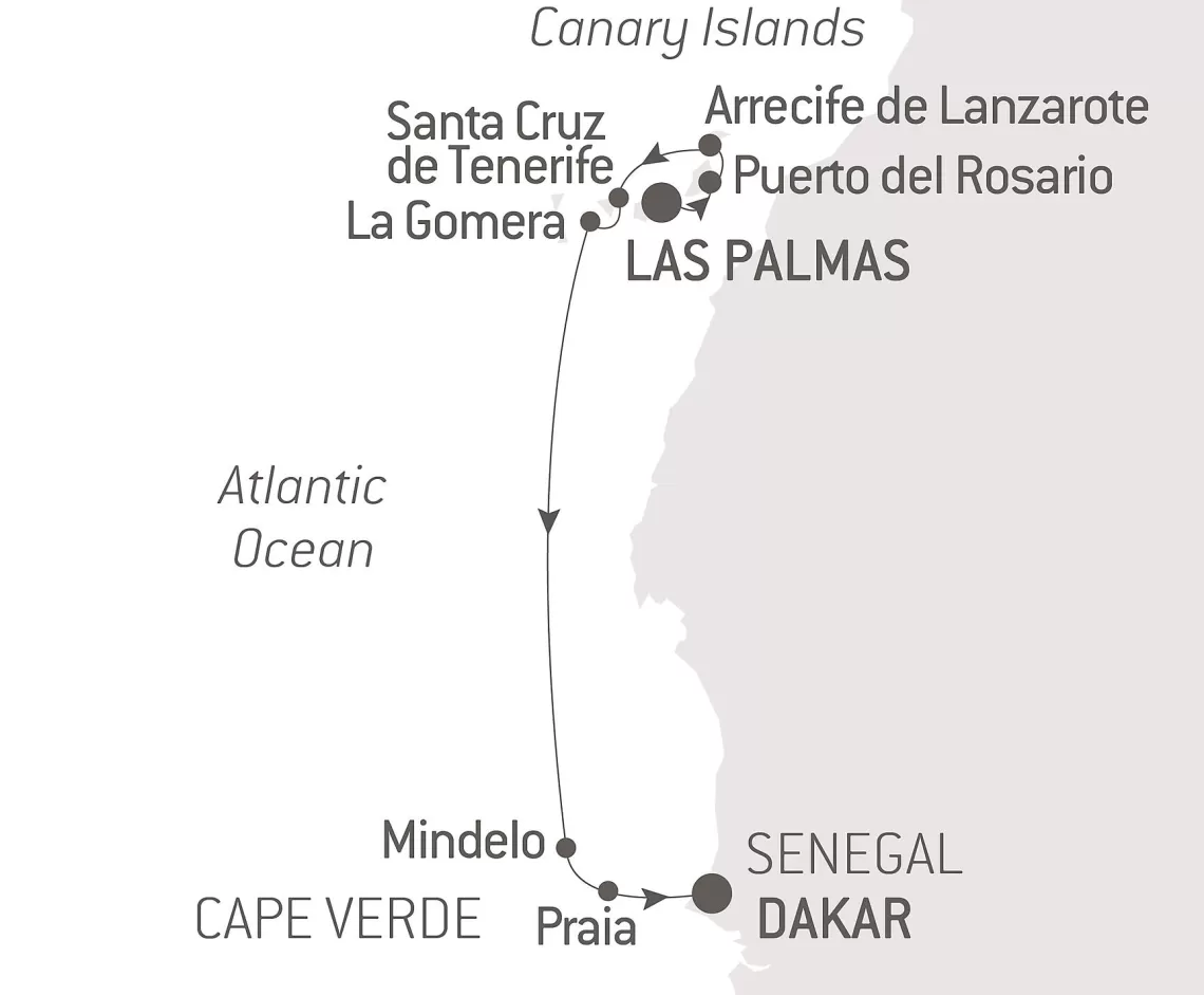 Маршрут круиза: Фуншал, о. Мадейра - Лас-Пальмас, о. Гран-Канария - Санта-Крус-де-ла-Пальма, о. Ла-Пальма - Санта-Крус-де-Тенерифе, о. Тенерифе - Аресифи, о. Лансароте - Пуэрто-дель-Росарио, о. Фуэртевентура - море - Санта-Крус-де-ла-Пальма, о. Ла-Пальма - Лас-Пальмас, о. Гран-Канария - Фуншал, о. Мадейра