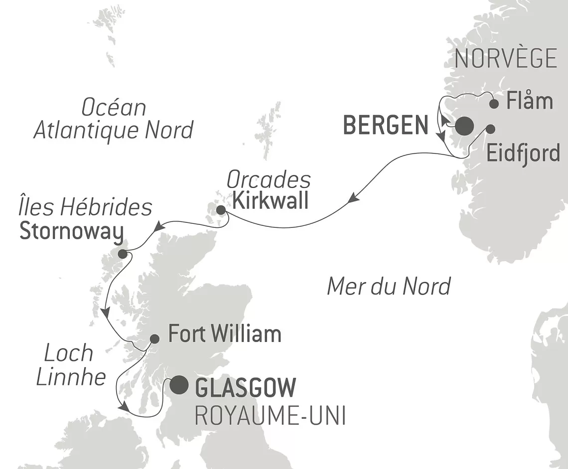 Маршрут круиза: Берген - Флом - Эйдфьорд - море - Керкуолл, Оркнейские острова - Сторновей - Форт-Уильям - озеро Лох-Линне - Гринок / Глазго