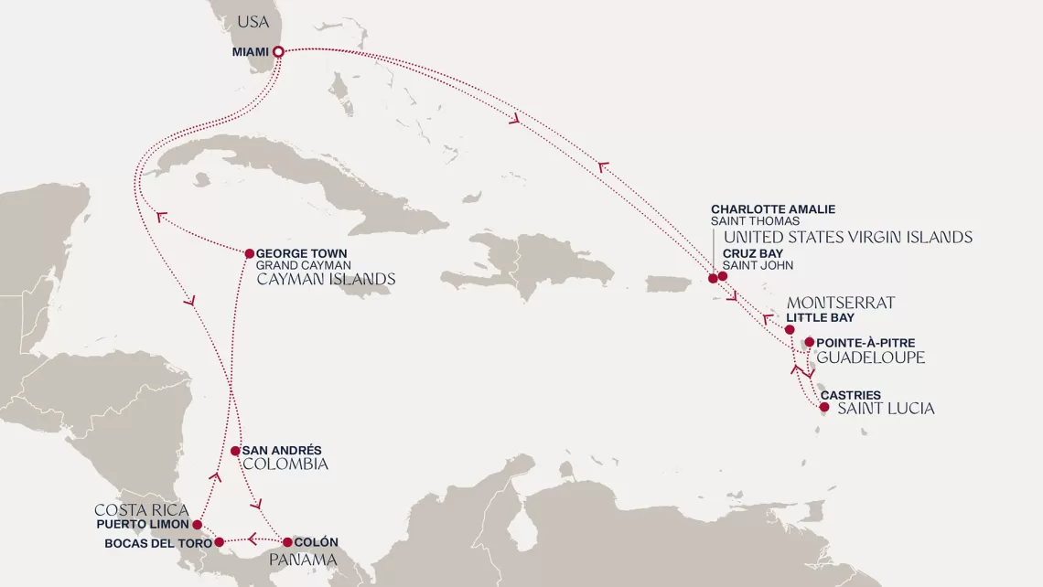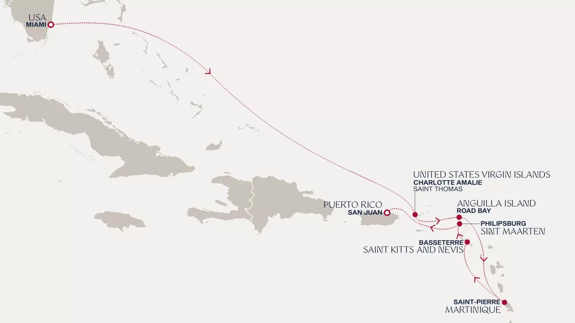 Маршрут круиза: Сан-Хуан - Филипсбург, о. Синт-Мартен - о. Тер-де-О, Гваделупа - Сент-Джорджес, о. Гренада - Кастри, о. Сент-Люсия - море - Пуэрто-Плата - море - Майами - море - море - Шарлотта-Амалия, о. Сент-Томас - Роуд Бэй, о. Ангилья - Сен-Пьер, о. Мартиника - Бастер, о. Сент-Китс - Филипсбург, о. Синт-Мартен - Сан-Хуан