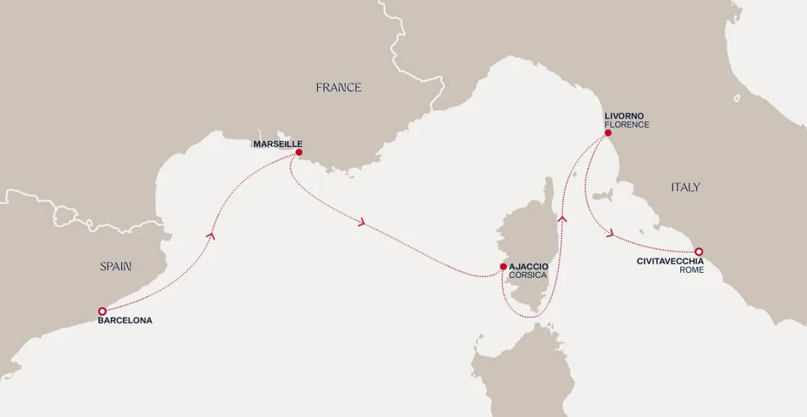 Маршрут круиза: Чивитавеккья / Рим - Аяччо, о. Корсика - Марсель - Барселона - море - море - Пуэрто-дель-Росарио, о. Фуэртевентура - Санта-Крус-де-Тенерифе, о. Тенерифе - море - море - море - море - море - море - Филипсбург, о. Синт-Мартен - Бастер, о. Сент-Китс - Кингстаун, о. Сент-Винсент - Бриджтаун, о. Барбадос - Сент-Джорджес, о. Гренада - море - Фор-де-Франс, о. Мартиника