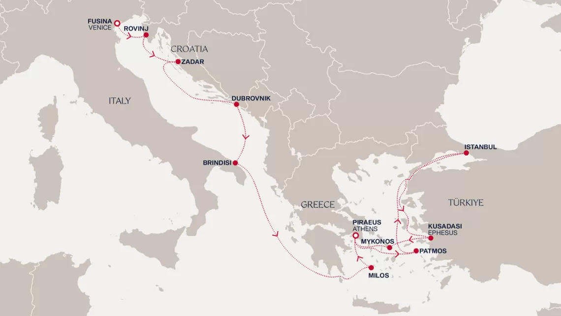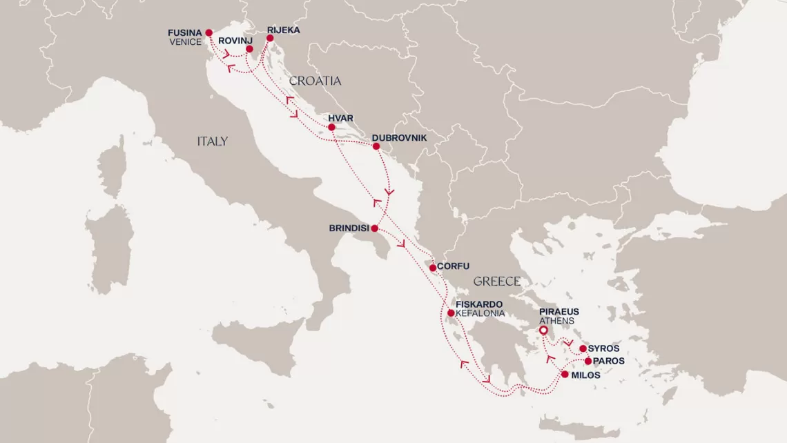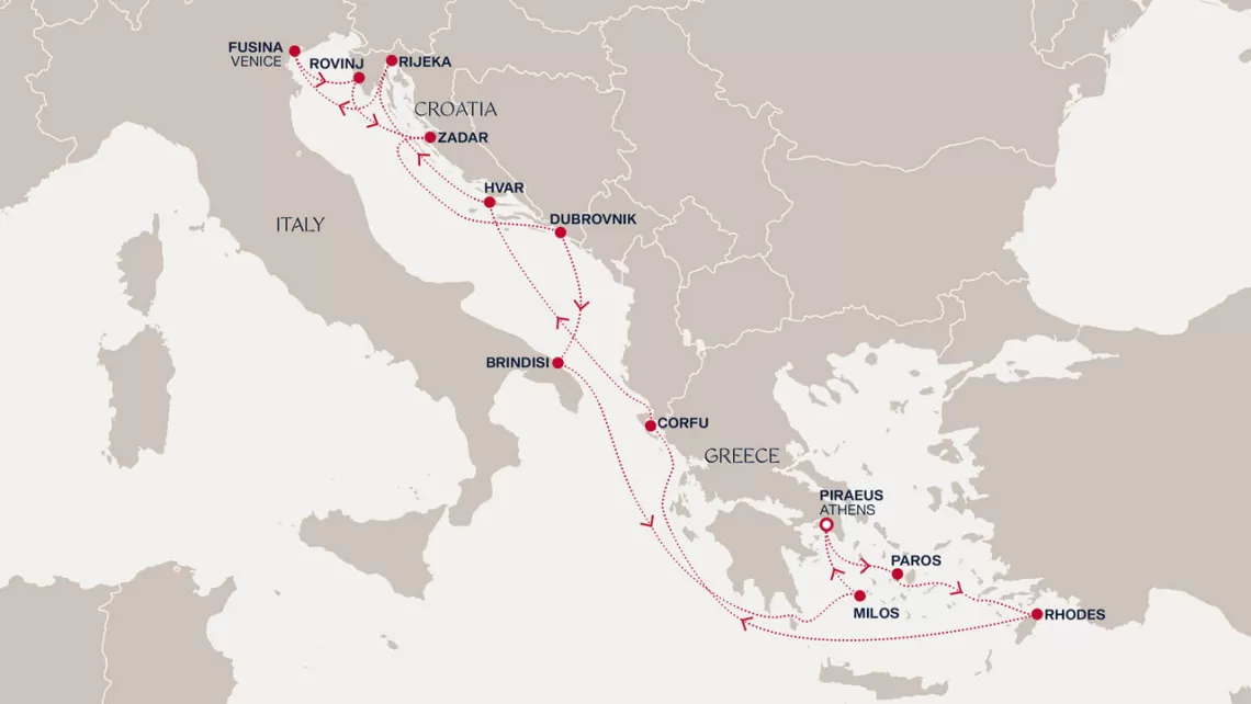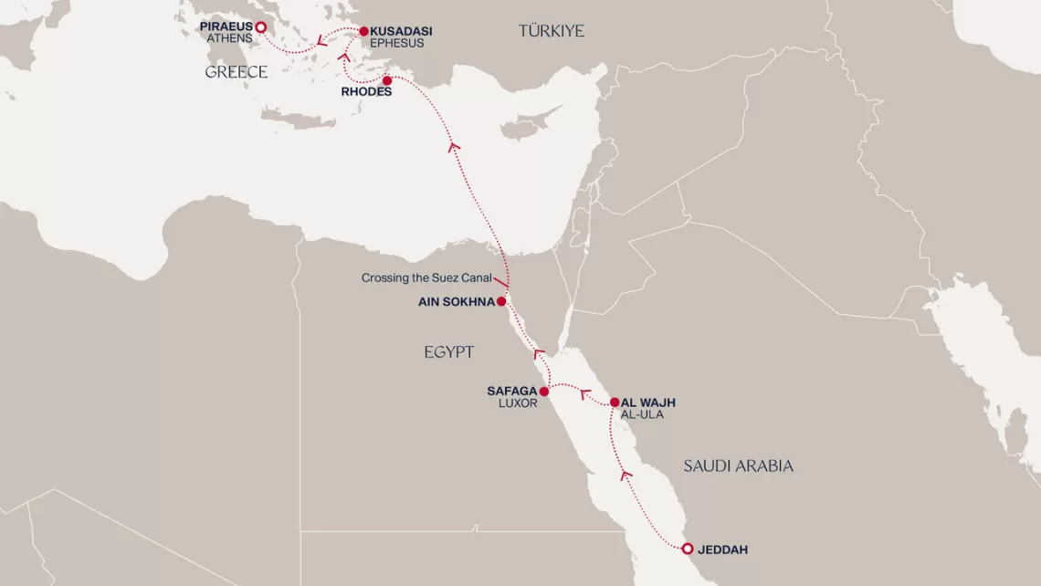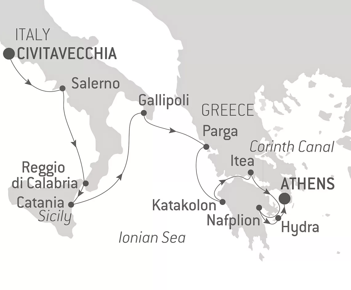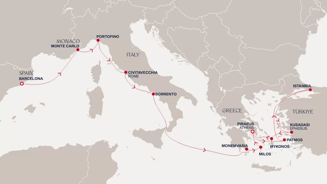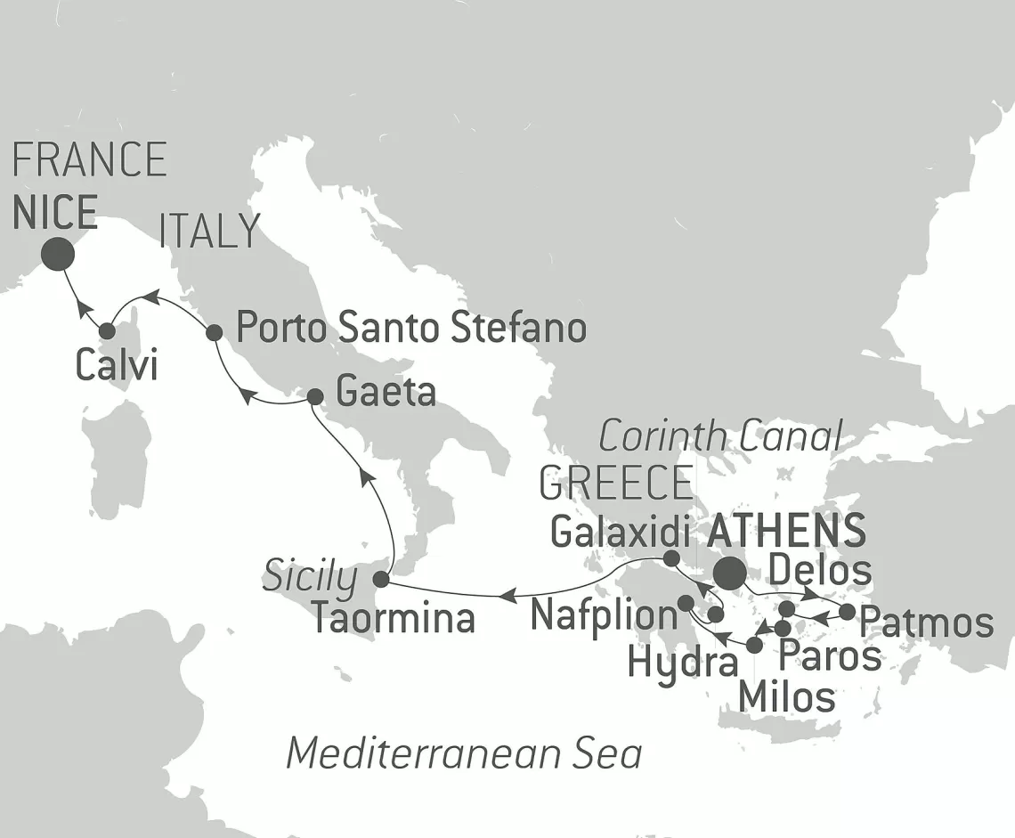 Маршрут круиза: Пирей / Афины - о. Милос - Ираклион, о.Крит - море - Джардини-Наксос, о. Сицилия - Валлетта - Ла-Гулетт - море - о. Ибица - Барселона - море - Кадиc / Севилья - Гибралтар - Мотриль - Картахена - море - Сен-Тропе - Монте-Карло - Ливорно / Флоренция, Пиза - Чивитавеккья / Рим