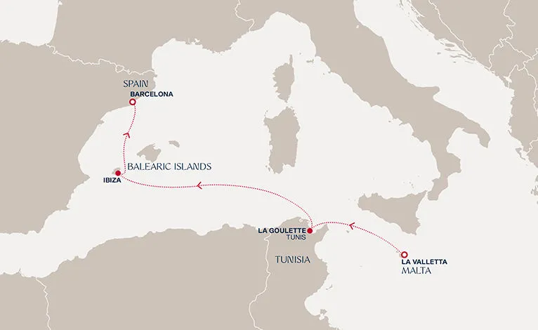 Маршрут круиза: Барселона - море - море - Санта-Крус-де-Тенерифе, о. Тенерифе - море - море - море - море - море - море - о. Гранд-Терк - море - о. Оушен Кей - море - Косумель - море - Лимон - Панамский канал - Панамский канал - море - Манта - море - Кальяо / Лима - Кальяо / Лима - море - Арика - море - море - море - море - море - Ханга-Роа, о. Пасхи - море - море - Баунти-Бэй - море - море - Папеэте, о.Таити - Папеэте, о.Таити - море - море - море - море - Нукуалофа, о. Тонгатапу - море - море - Нумеа - море - море - Окленд - Тауранга - Нейпир - Пиктон - Веллингтон - море - море - море - Сидней - Сидней - море - море - море - море - Кэрнс - Кэрнс - Кэрнс - Кэрнс - Кэрнс - Кэрнс - море - море - море - море - о. Ломбок - Беноа, о. Бали - море - море - море - Хошимин - море - море - Халонг Бэй / Ханой - Халонг Бэй / Ханой - Чан Мэй - море - море - Лаем Чабанг / Бангкок - море - Сиануквиль - море - море - Сингапур - Порт-Кланг - море - море - море - Коломбо - Кочин - море - Мумбаи (быв. Бомбей) - Мумбаи (быв. Бомбей) - море - море - море - Дубай - Дубай - Маскат - море - море - море - море - море - Акаба - Суэцкий Канал - Суэцкий Канал - Александрия - море - море - Чивитавеккья / Рим - Генуя / Милан - Марсель - Барселона