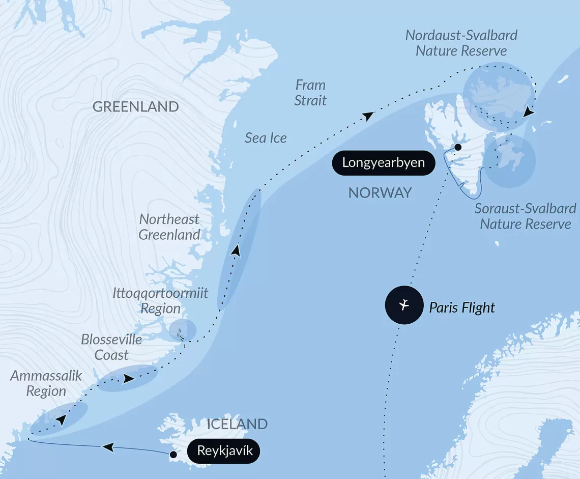 Маршрут круиза: Лонгийр - море - Природный заповедник Серауст-Шпицберген - Хинлопенский пролив - Северо-Восточный Шпицбергенский заповедник - Северо-Восточный Шпицбергенский заповедник - море - море - Исследование Северо-восточной Гренландии - Исследование Северо-восточной Гренландии - Исследование Северо-восточной Гренландии - Исследование Северо-восточной Гренландии - Иллоккортоормиут - побережье Блосвиль - о. Аммассалик - море - Рейкьявик