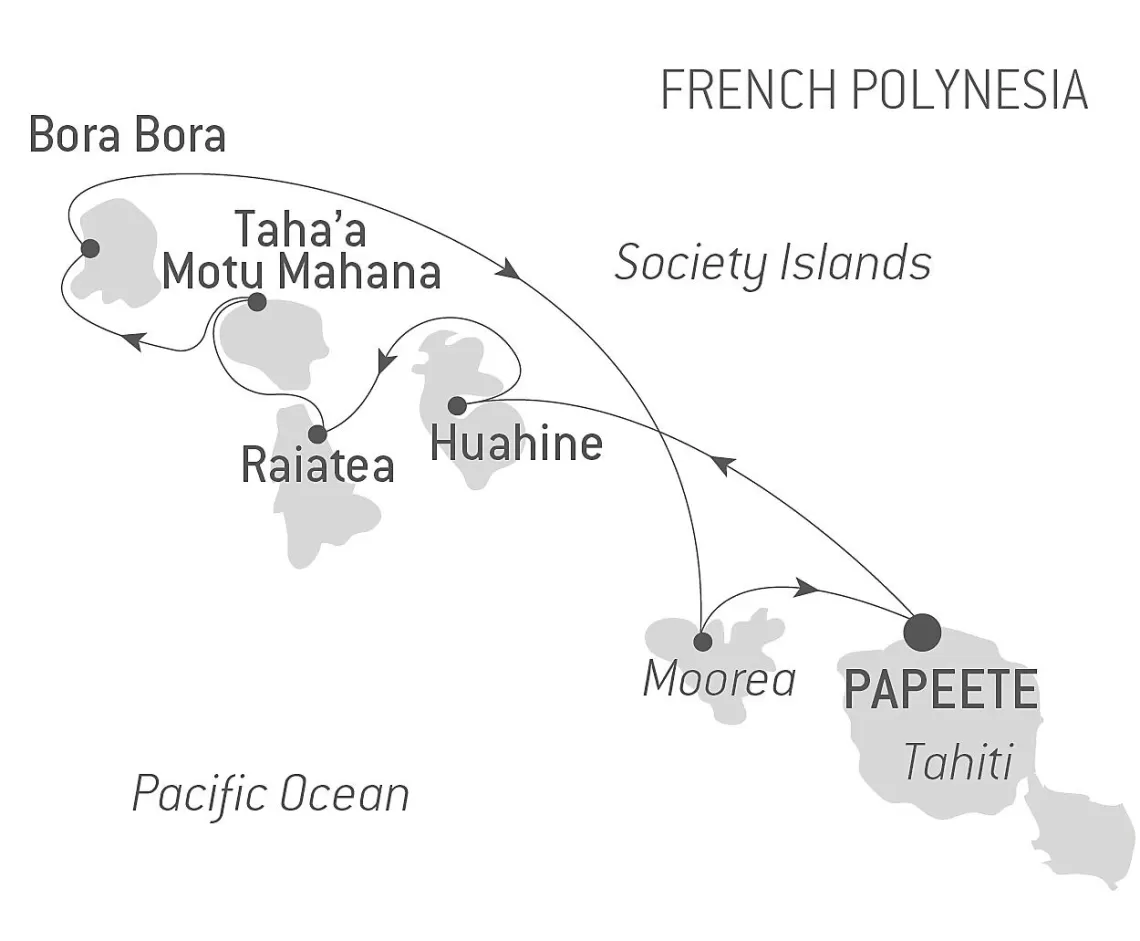 Маршрут круиза: Папеэте, о.Таити - о. Хуахине - о. Райатеа - о. Тахаа - о. Бора-Бора - о. Бора-Бора - о. Муреа - Папеэте, о.Таити - Папеэте, о.Таити