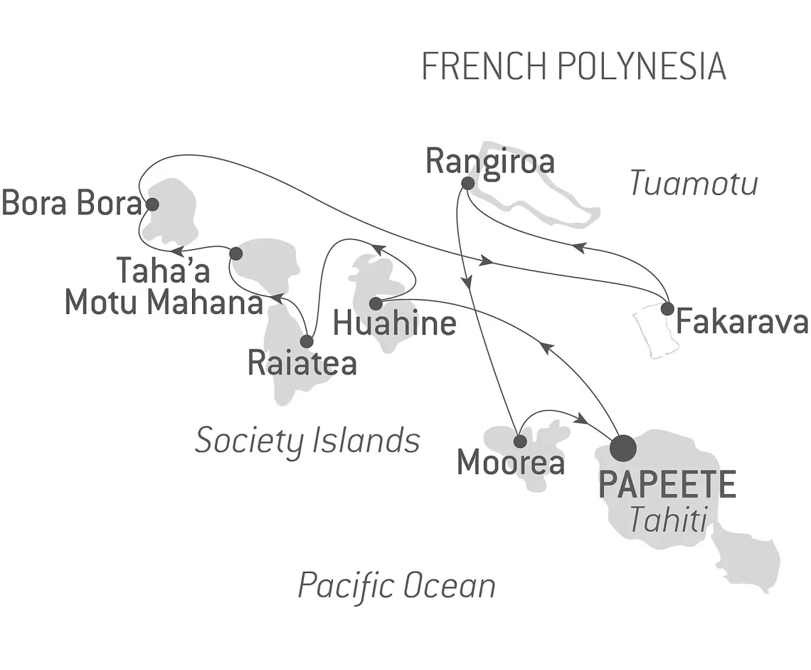 Маршрут круиза: Папеэте, о.Таити - о. Факарава - о. Факарава - о. Рангироа - о. Хуахине - о. Бора-Бора - о. Бора-Бора - о. Райатеа - о. Тахаа - о. Муреа - Папеэте, о.Таити - Папеэте, о.Таити