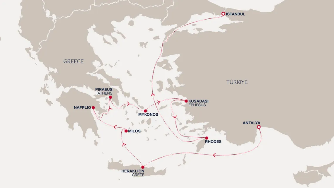 Маршрут круиза: Майами - море - море - Кингс Варф, о. Айрленд-Айленд - Кингс Варф, о. Айрленд-Айленд - море - море - море - море - Орта, о.Фаял - Понта-Делгада, о.Сан-Мигел - море - море - Кадиc / Севилья - Малага - море - Барселона - море - Монте-Карло - Портофино - Чивитавеккья / Рим - Сорренто - море - Монемвасия - о. Милос - Пирей / Афины