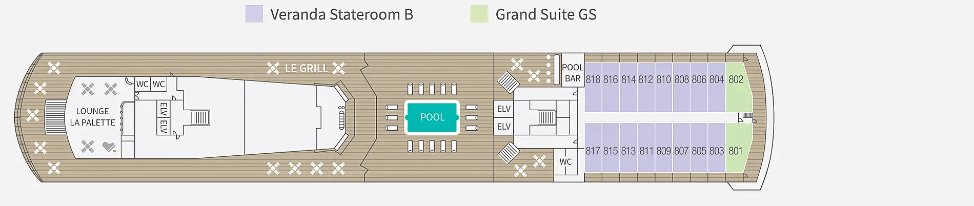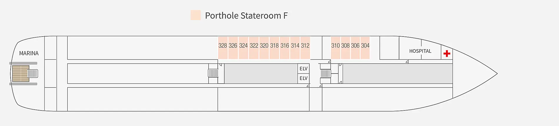 Расположение каюты можно посмотреть на плане палуб во вкладке "Круизный лайнер" на странице выше. Первые цифры номера каюты - номер палубы. Каюты отмеченные "для инвалидов" могут быть заменены MSC на каюту той же категории с другим расположением на лайнере без согласования с Клиентом.