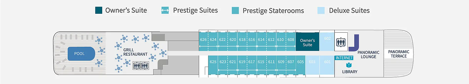 Расположение каюты можно посмотреть на плане палуб во вкладке "Круизный лайнер" на странице выше. Первые цифры номера каюты - номер палубы. Каюты отмеченные "для инвалидов" могут быть заменены MSC на каюту той же категории с другим расположением на лайнере без согласования с Клиентом.
