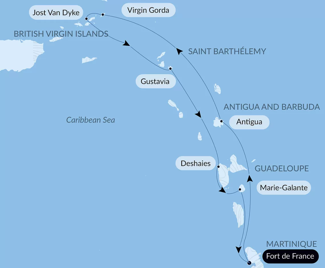 Маршрут круиза: Мариго, о. Сен-Мартен - о. Санди - море - о. Верджин-Горда - о. Купер - о. Норман - Лонг Бэй, Биф-Айленд - о. Йост-Ван-Дайк - Лонг Бэй, Биф-Айленд - остров Дог-Айленд - Мариго, о. Сен-Мартен