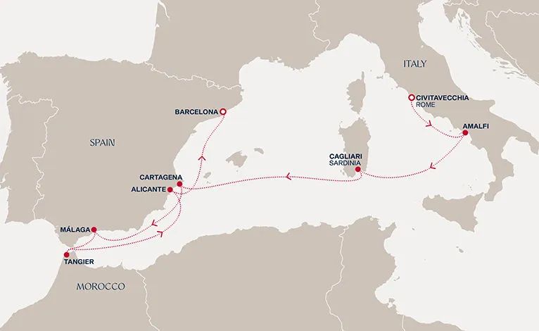 Маршрут круиза: Марсель - Генуя / Милан - Чивитавеккья / Рим - Мессина, о. Сицилия - Валлетта - море - Барселона - Марсель