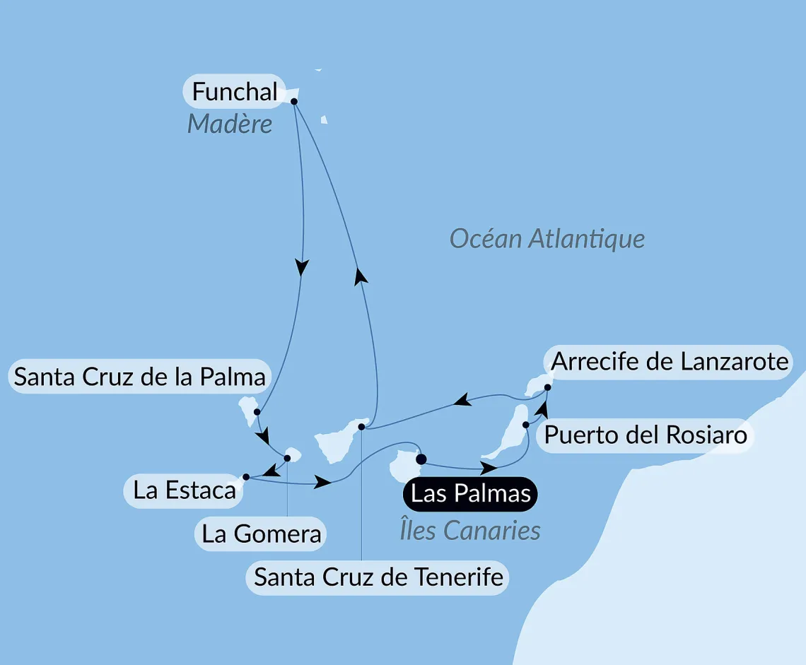 Маршрут круиза: Лас-Пальмас, о. Гран-Канария - Аресифи, о. Лансароте - Пуэрто-дель-Росарио, о. Фуэртевентура - Аресифи, о. Лансароте - Санта-Крус-де-Тенерифе, о. Тенерифе - море - Фуншал, о. Мадейра - Фуншал, о. Мадейра - Санта-Крус-де-ла-Пальма, о. Ла-Пальма - Пуэрто де ла Эстака, о. Иерро - Сан-Себастьян-де-ла-Гомера - Лас-Пальмас, о. Гран-Канария