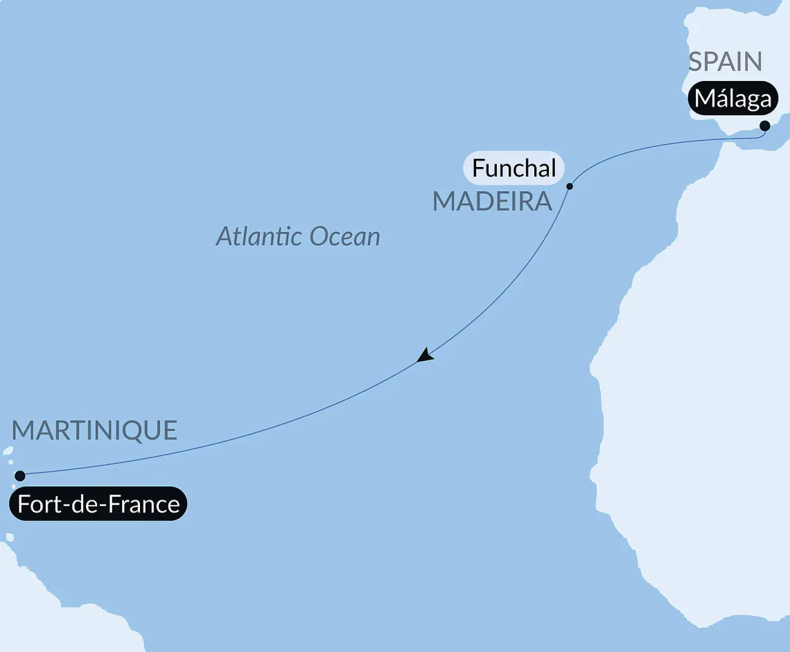 Маршрут круиза: Лас-Пальмас, о. Гран-Канария - Санта-Крус-де-Тенерифе, о. Тенерифе - Сан-Себастьян-де-ла-Гомера - Санта-Крус-де-ла-Пальма, о. Ла-Пальма - Фуншал, о. Мадейра - Фуншал, о. Мадейра - море - Кадиc / Севилья - Портиман - Лиссабон - Лиссабон