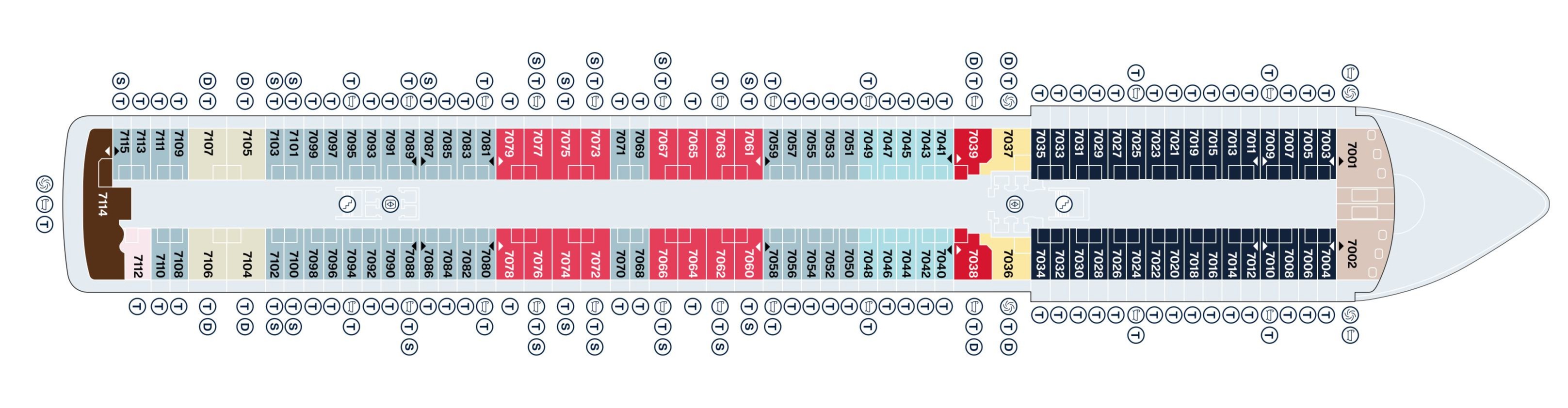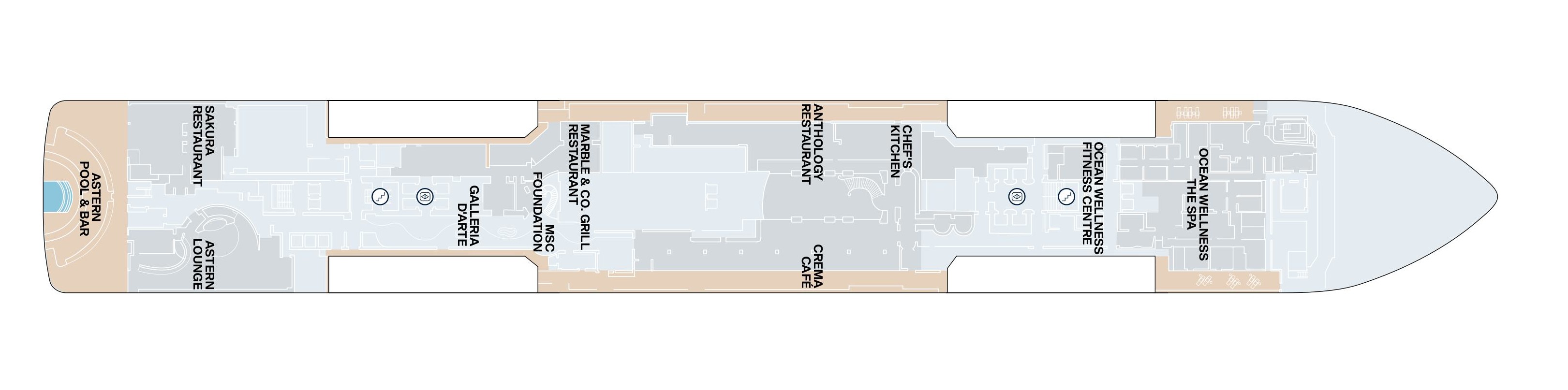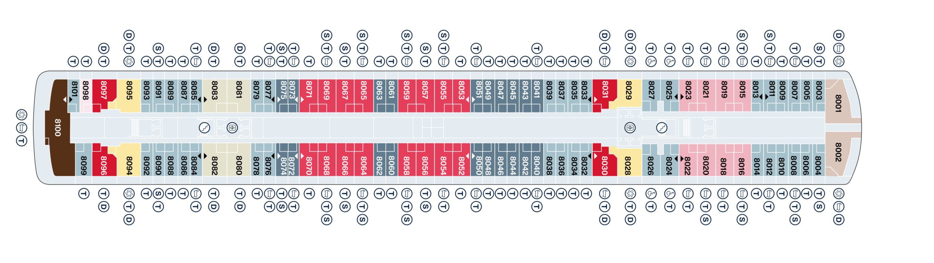 Расположение каюты можно посмотреть на плане палуб во вкладке "Круизный лайнер" на странице выше. Первые цифры номера каюты - номер палубы. Каюты отмеченные "для инвалидов" могут быть заменены MSC на каюту той же категории с другим расположением на лайнере без согласования с Клиентом.